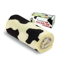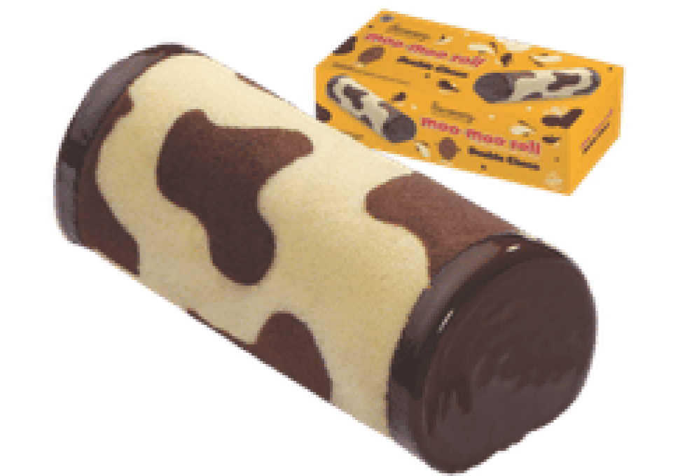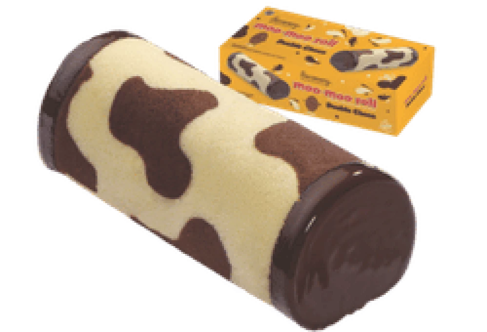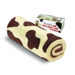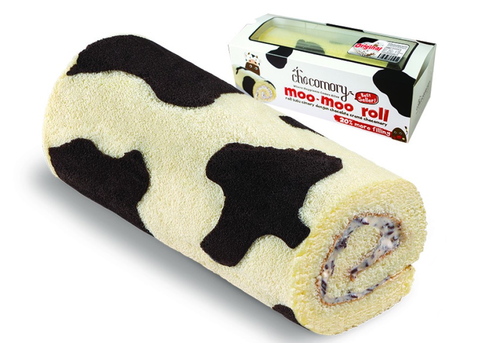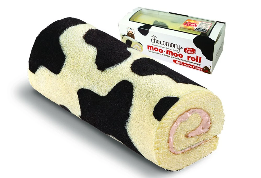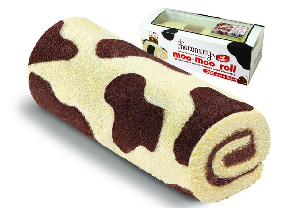 Bolu gulung dengan motif sapi berwarna putih dan coklat dengan extra filling creme cokelat khas chocomory dengan potongan real cokelat di dalamnya, serta lapisan cokelat di ujung kanan & kirinya