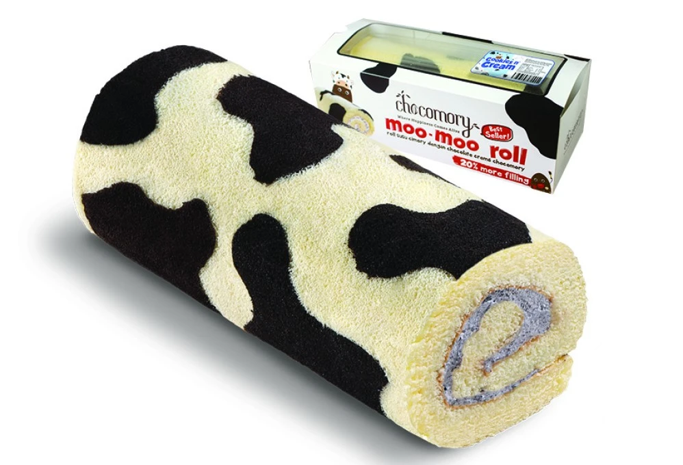 Bolu gulung dengan motif sapi berwarna putih dan hitam dengan filling creme vanilla khas chocomory dengan potongan real cokelat di dalamnya